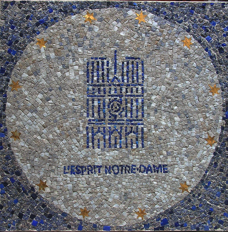 L'Esprit Notre-Dame Hommage aux Compagnons ayant oeuvré pour la restauration de la Cathédrale de Paris Logotype de Philippe Apeloig *** Marbre, granit, pâte de verre et or de Venise 80 x 80 cm
