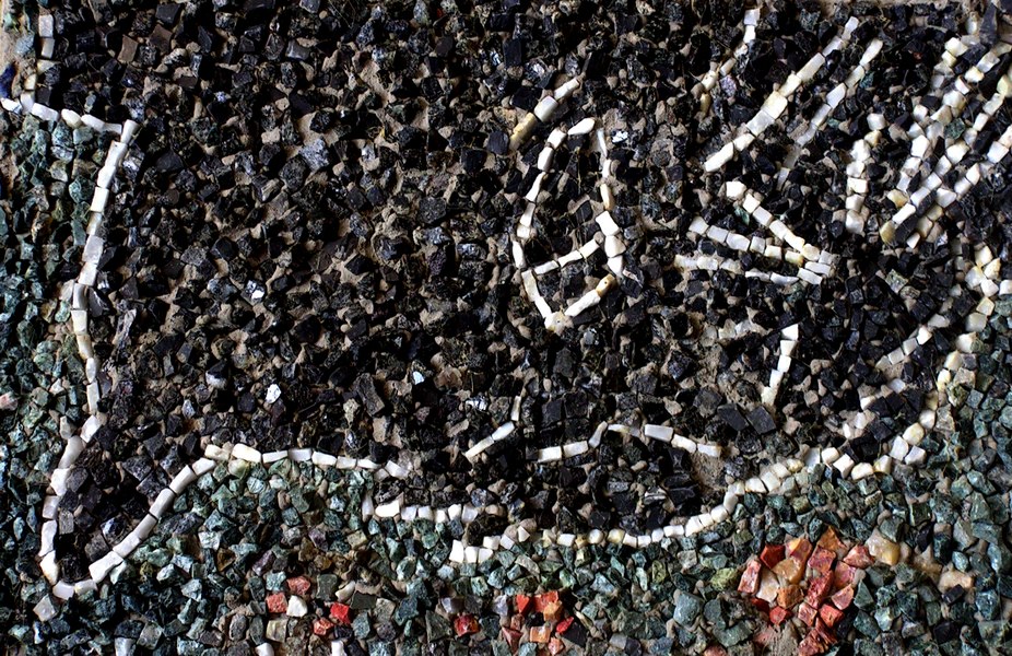 Premier travail Technique romaine - Marteline et tranchet - Pose directeMosaïque protégeant du mauvais oeil