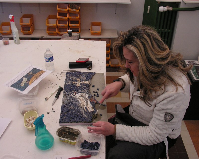 Premier travail Technique romaine en pose directe au mortier-colle - En cours Outilllage: marteline, tranchet et pinces japonaises